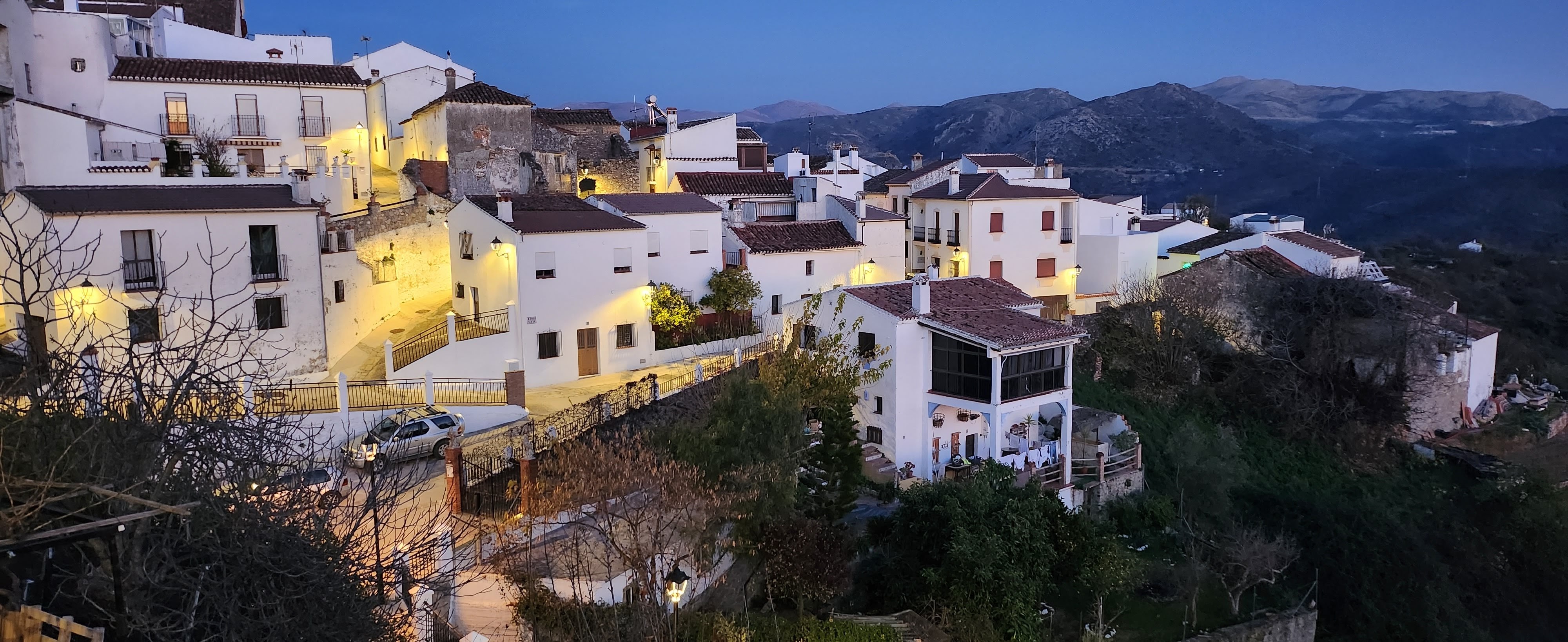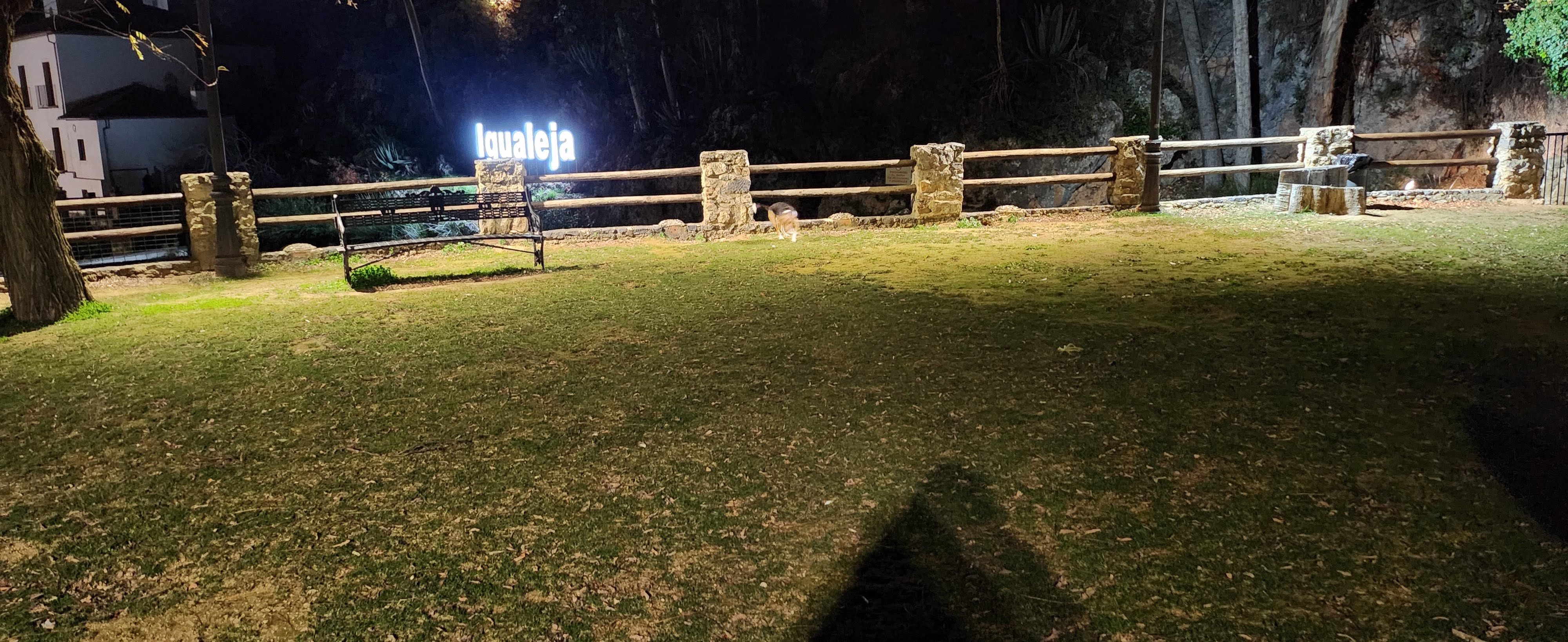 Igualeja. Llegada la noche alcanzamos un gran estacionamiento en la Sierra de las Nieves, pero nos percatamos de un cartel donde indicaba que no podíamos pernoctar, por lo que decidimos bajar a Igualeja, para estacionar junto al nacimiento del río Genal (para pernoctar hay que tener en cuenta la normativa vigente de cada zona). Este lugar nos cautivó, muy bonito paraje, jardines bien cuidados, unas vistas espectaculares y muy cerca de varias rutas de senderismo y la vía ferrata del mismo nombre, de dificultad K3, ideal para iniciados en la escalada.