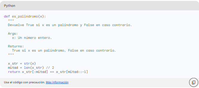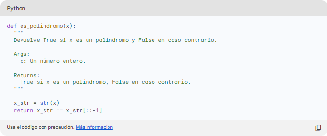 - Bard: Se ha mostrado más educativo en su solución, ha generado un código autodocumentado, que explica qué hace la función, sus argumentos de entrada y la salida, además de bastante limpio en su segunda propuesta (más eficiente que la primera). En general, una respuesta muy completa que probablemente gustará mucho a quienes se están iniciando en el desarrollo de software, pero también a experimentados que verán en la solución un código ordenado y documentado correctamente.