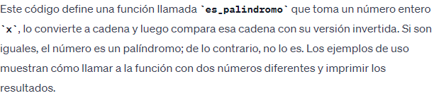 - ChatGPT: Ha sido más breve en su respuesta pero ha llegado a la misma conclusión de código generado que Bard. A diferencia de Bard, el código autodocumentado de ChatGPT no explica qué hace la función en sí, pero va explicando qué hace cada línea de código individualmente, cuestión que ayuda a quien está aprendiendo a programar. No obstante, tras el código explica qué hace la función.