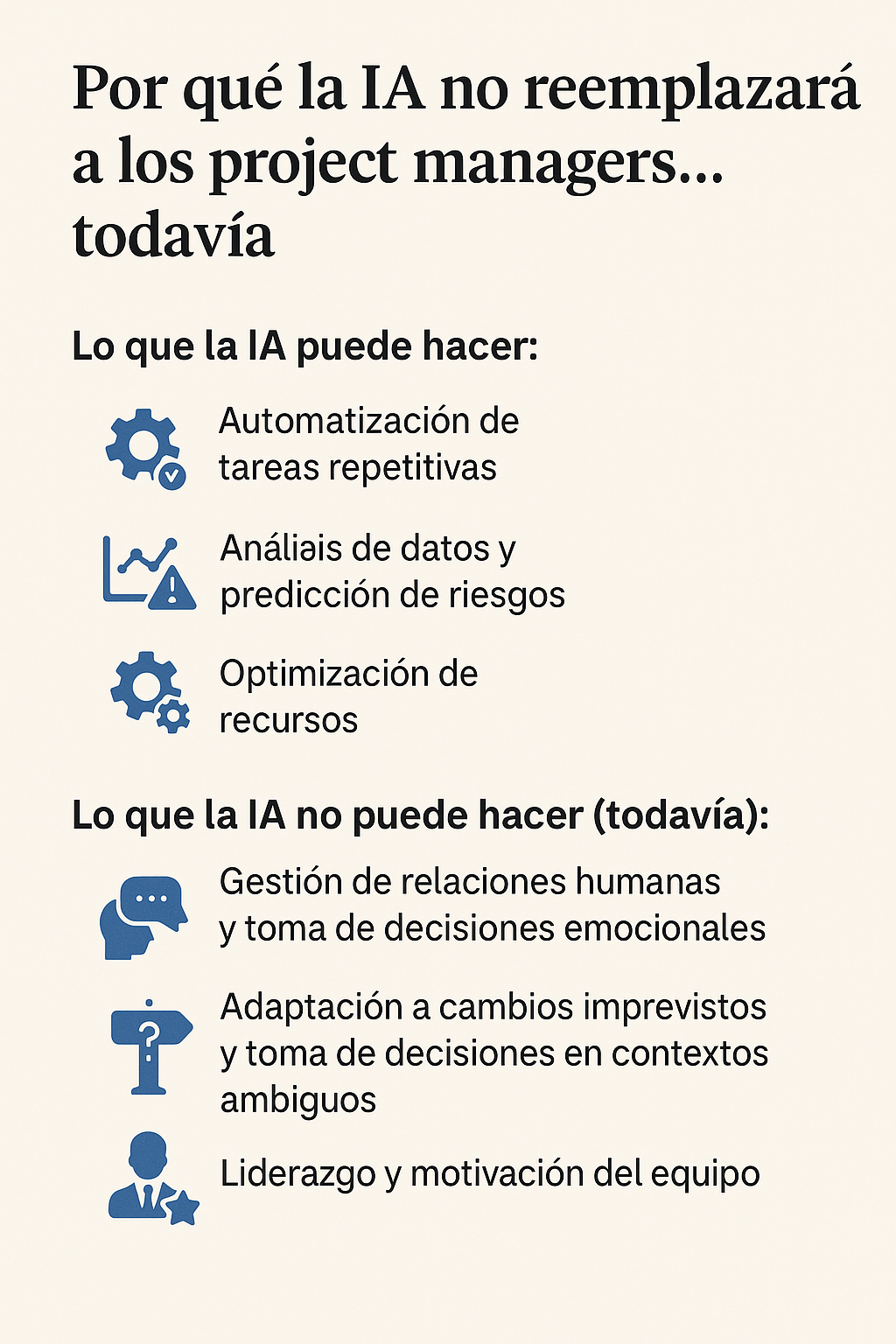 El liderazgo es una habilidad exclusivamente humana que la IA aún no puede replicar. Un buen project manager no solo organiza y supervisa el trabajo, sino que también inspira y motiva a su equipo, crea un ambiente de confianza y colabora estrechamente con todas las partes interesadas. Ejemplo práctico: